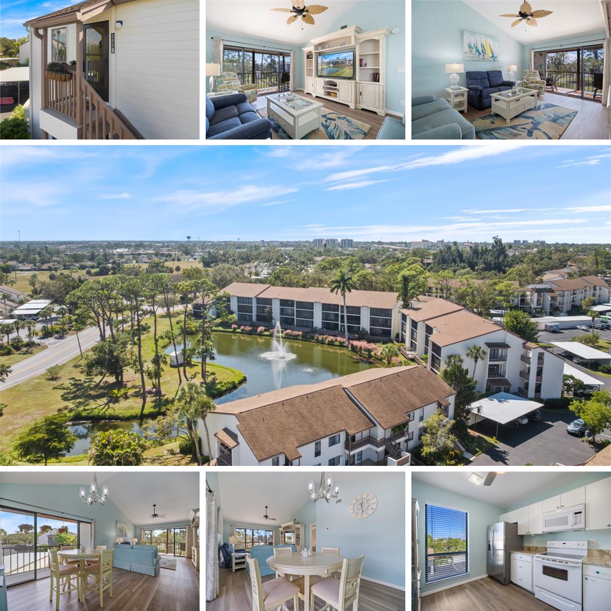 Welcome to this bright and freshly painted second-floor corner unit in Bird Bay Village. This spacious condo features an open floor plan with vaulted ceilings, two lanais, and peaceful pond and fountain views. Luxury vinyl plank flooring runs through the living room, dining area, kitchen, guest bath, and hallway for a clean and cohesive look. The kitchen offers quartz countertops, modern appliances, and a convenient pass-through to the dining area.